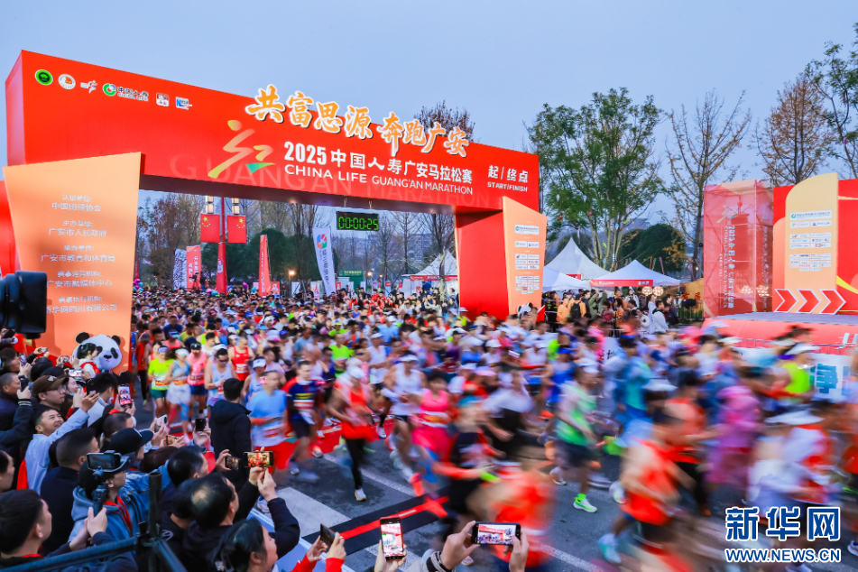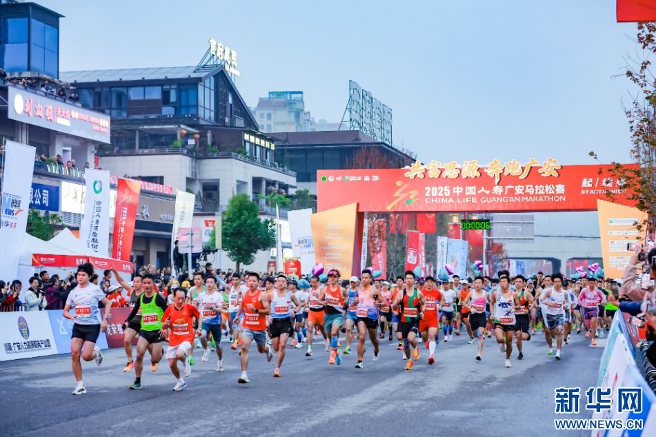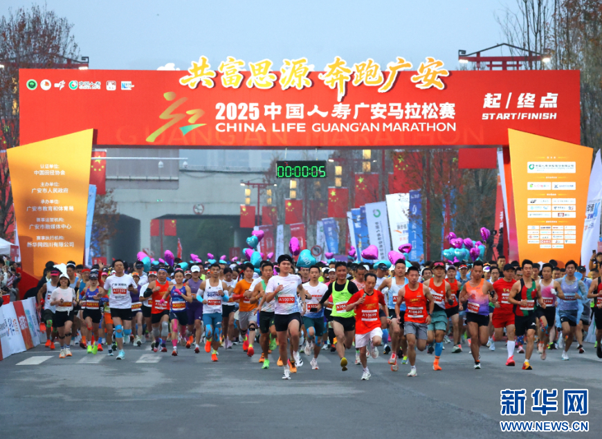 “共富思源 奔跑广安”。11月16日,2025中国人寿广安马拉松赛在四川省广安市新地标賨城里鸣枪开跑。上万名跑者用脚步丈量这座红色名城的独特魅力。