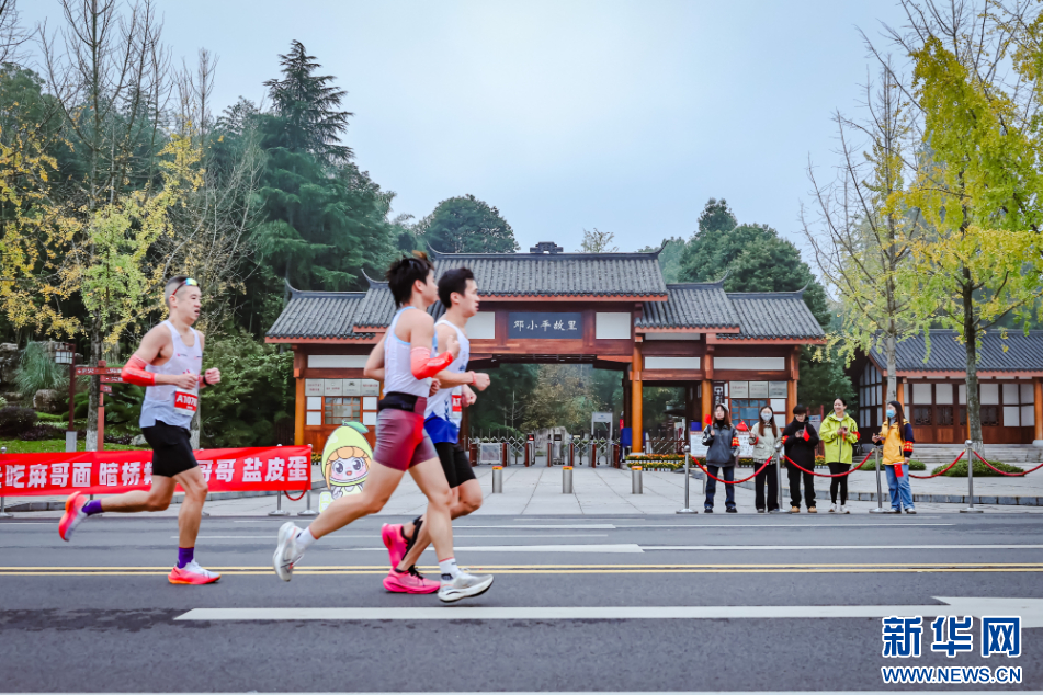 11月16日,参赛选手跑过邓小平故里景区。当日,2025广安马拉松赛鸣枪开跑。新华网发(组委会供图)