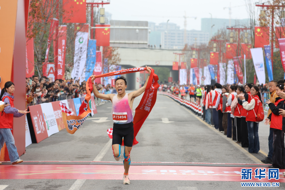 11月16日,马拉松男子组冠军王汝琴冲线瞬间。当日,2025广安马拉松赛鸣枪开跑。新华网发(曹鹏 摄)