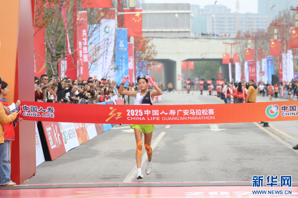11月16日,马拉松女子组冠军周昊冲线瞬间。当日,2025广安马拉松赛鸣枪开跑。新华网发(曹鹏 摄)