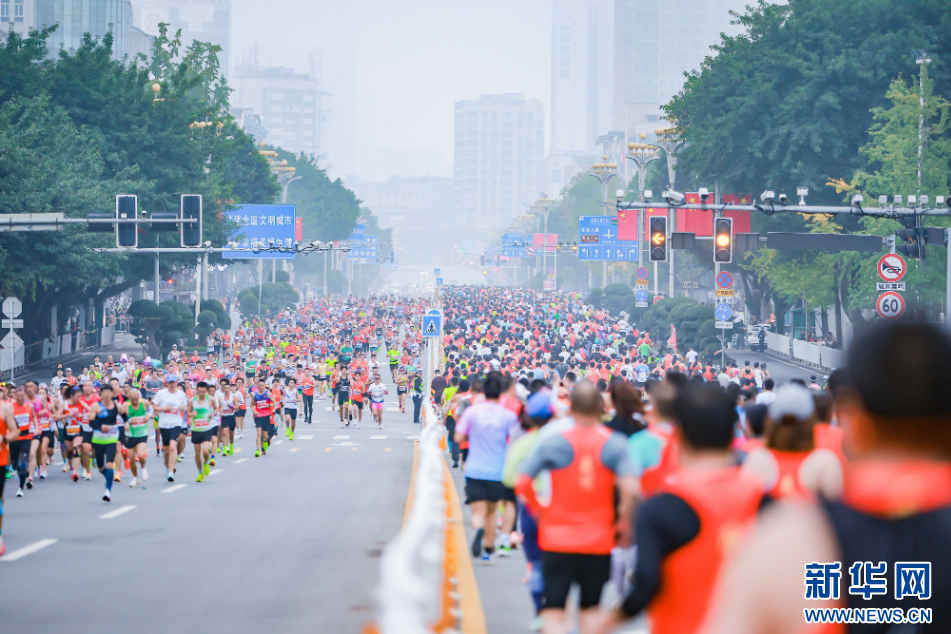 11月16日,2025广安马拉松赛起跑瞬间。当日,2025广安马拉松赛鸣枪开跑。新华网发(曹鹏 摄)