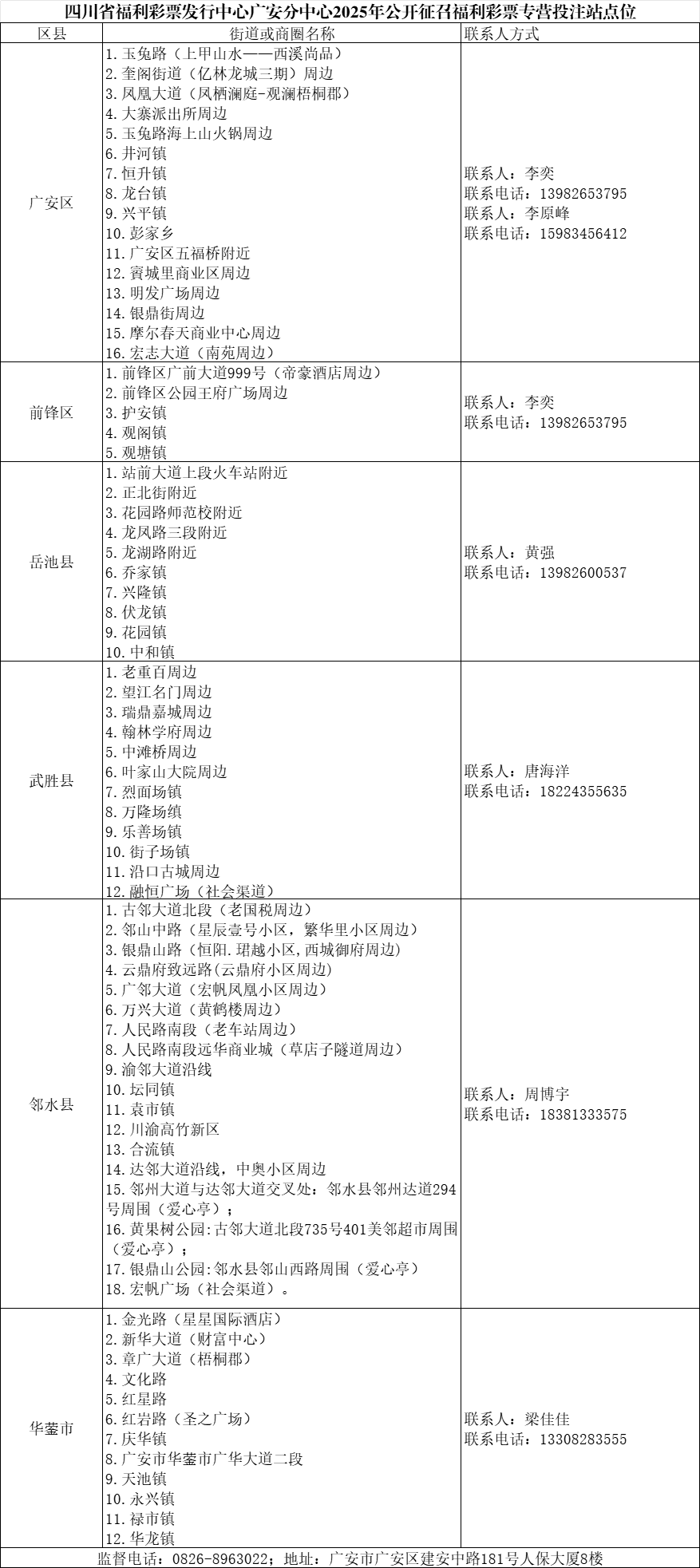 为优化网点布局,填补我市福利彩票销售盲区,加强渠道管理效能,提升福利彩票安全发展质效,依据《中福彩中心关于进一步加强代理销售规范管理的通知》(中彩发字[2024]80号)、《四川省福利彩票发行中心关于规范销售网点准入审批程序的通知》(川福彩发[2024]103号)和《四川省福利彩票发行中心广安分中心关于2025年公开征召传统渠道福利彩票专营投注站的公告》要求,四川省福利彩票发行中心广安分中心2025年面向社会公开征召福利彩票专营投注站。现公告各区市县征召区域如下,详情及申请事宜请咨询联系人。