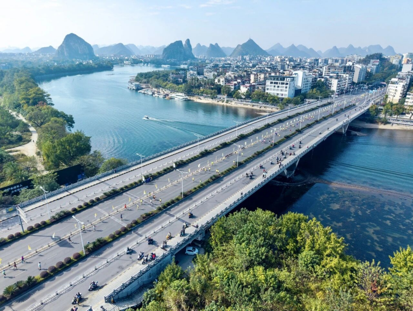 2025桂林马拉松在赛道设计上沿用备受跑友盛赞的经典线路,将桂林山水灵韵与人文底蕴尽数串联。跑者从桂林中心广场出发,率先穿行象山景区、木龙湖景区、西山公园、七星景区等城市绿肺,沉浸式感受“城在景中,景随步移”的生态之美;继而途经日月双塔、逍遥楼、靖江王城、八路军桂林办事处纪念馆、广西省立艺术馆、救亡日报社旧址等历史地标,在奔跑中领略桂林绵长深厚的人文底蕴。