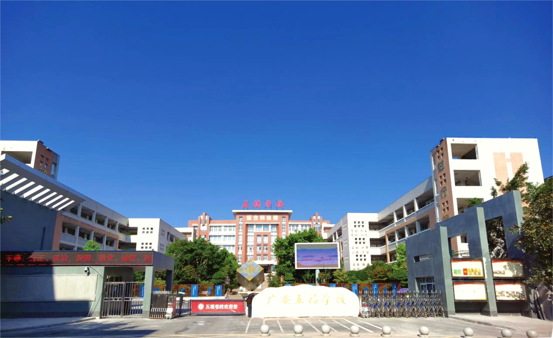 广安市广安区五福学校是一所九年一贯制公立学校,学校占地65亩,现有40个教学班,初中26个班,小学14个班,近2000名学生。近几年,学校成为全国基础教育科研实验基地、广安市示范家长学校、广安市文明校园、广安市现代教育技术示范学校、广安市依法治校示范学校、广安市阳光体育示范学校、广安市校本教研科研基地学校、枣山园区先进基层党组织、枣山园区党风廉政建设先进单位。