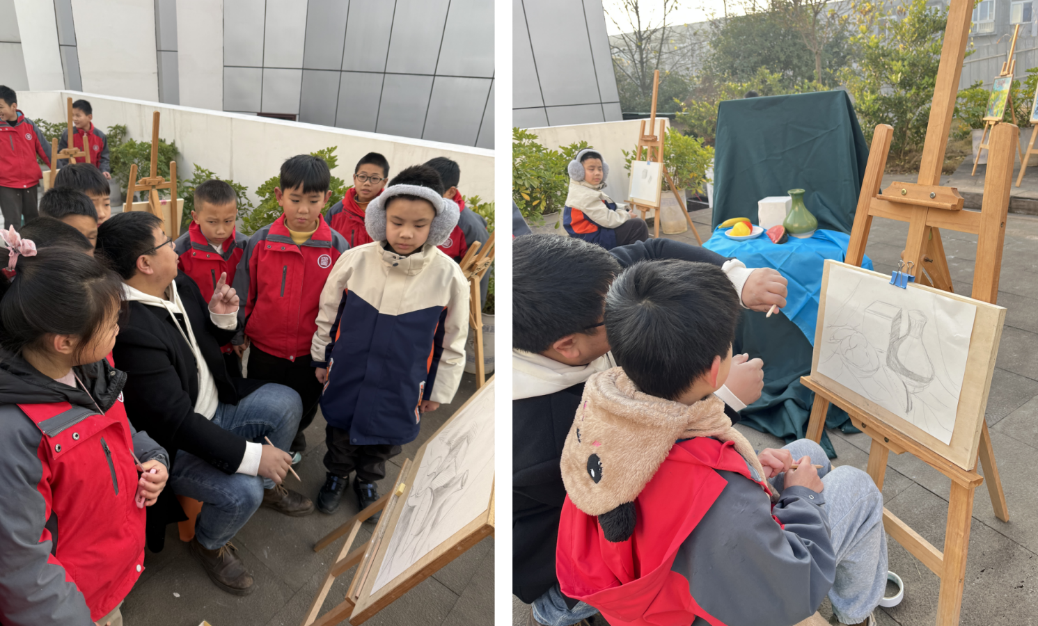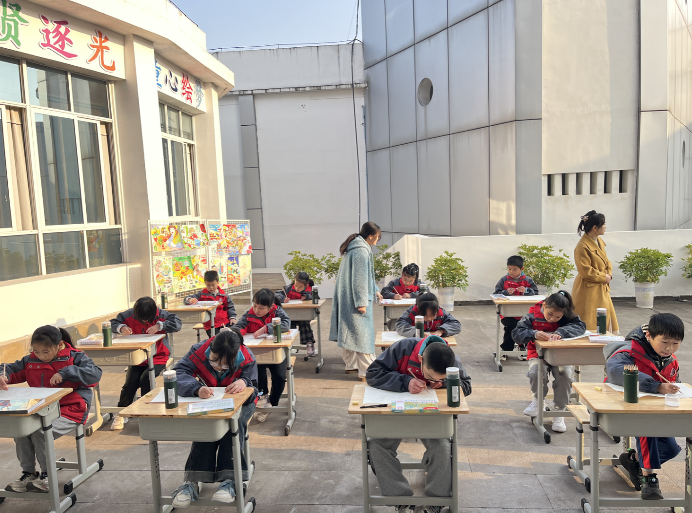 室外空坝上,10余名素描、儿童绘画组学生沉浸写生,用画笔定格美好瞬间。